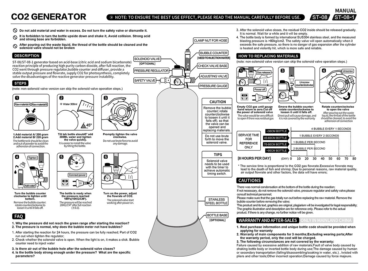 Il generatore di CO2 per acquario ST-08-1 utilizza il principio di una reazione acido-base, facendo reagire l'acido citrico con il bicarbonato di sodio per produrre CO2 di elevata purezza. Attraverso una formula scientificamente formulata e un efficiente processo di reazione, il dispositivo rilascia costantemente CO2, fornendo una fornitura continua di gas alle piante dell'acquario, soddisfacendo le loro esigenze di fotosintesi e promuovendo una crescita sana. Rispetto ai tradizionali generatori di tipo a reazione, l'ST-08-1 presenta un migliore controllo della pressione. Dotato di un regolatore di pressione, un contabolle e un diffusore dedicati, fornisce una pressione di uscita stabile e una dispersione uniforme delle bolle, eliminando gli inconvenienti causati dalle fluttuazioni di pressione.